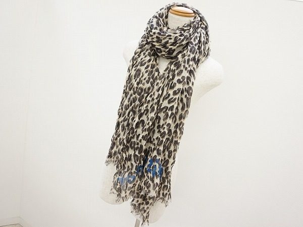 上品なベージュがかった色合いのレオパードで、様々な着こなしにマッチする、使いやすいデザインのストールとなっております。