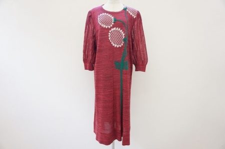 斉藤都世子ニットワンピースを宅配買取にて買取しました。長く伸びたひまわりが華やかな1枚です。ロングニットワンピースでありながら、お袖は少し短めでバルーン調になっているので、ダボっとした印象もなくスマートに着ていただけます。黒のブーツと合わせていただいてもメリハリがついておすすめです。