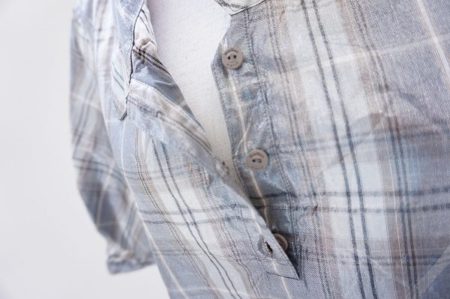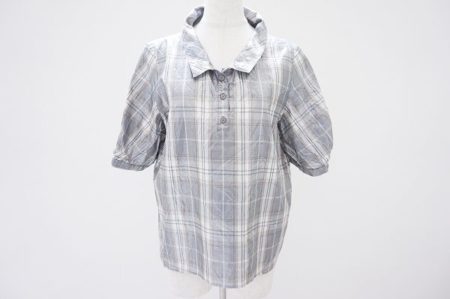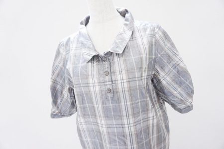 淡いブルーグレー系のチェック柄で程よく締まりのある印象のこちらのブラウスは、ふんわりと女性らしい肩のラインを演出してくれます。