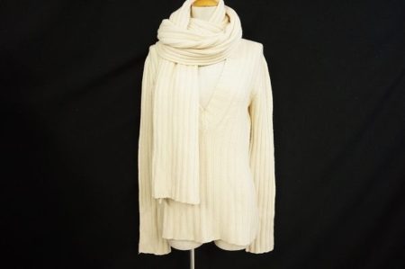 アイボリーカラーのやわらかい印象でフェミニンなVニットとマフラーのセットです。