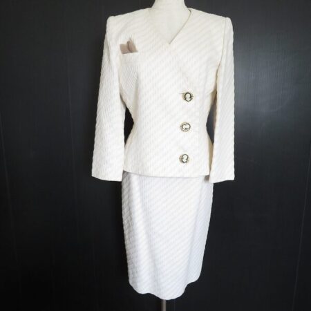 銀座マギーのスカートスーツを出張買取ご利用のお客様より買取しました。上品な雰囲気が感じられます。サイズは9号です。お仕事はもちろんのこと、セレモニーなどにも大活躍しそうなスカートスーツです。何より気品を出してくれる雰囲気がありがたい1枚。