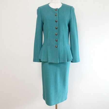 セントジョンのスカートスーツを出張買取ご利用のお客様より買取しました。タイトでありつつも広がりもバランスよくあり抑揚が付いています。全体的なデザインが綺麗なだけでなく色合いも綺麗です。女性の華美な雰囲気を出していただけます。