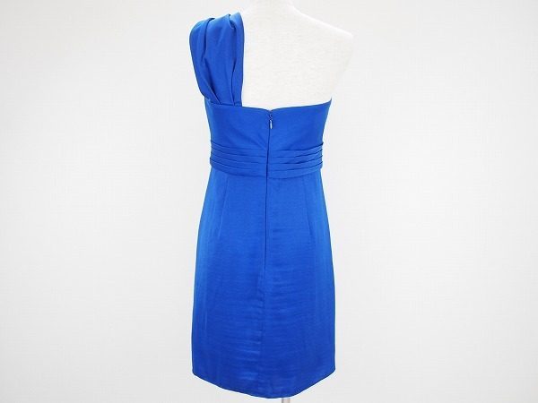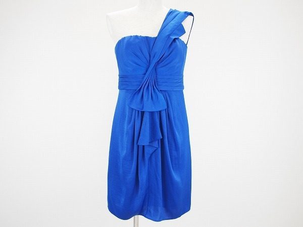 ワンショルダーと絶妙な着丈、フロントのドレープ感が大人っぽさと可愛さの両方を引き出してくれますね。目の覚めるような品のあるブルードレスは、パーティで一段と華やかに見せてくれるはず。