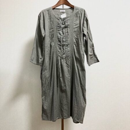 出張買取でプランテーションのワンピースを買取しました。サイズはM、七分袖です。しっかりしつつもカジュアルさが余る1点。胸元のギャザーも効いていて、高級感を出していただけます。