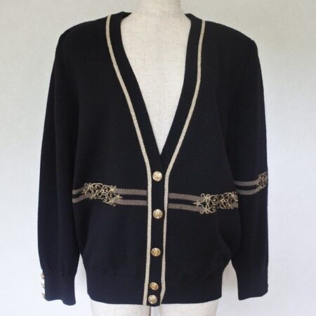 黒と金のコントラストが素敵なカーディガン。出張買取にて買取しました。ブランドはレリアンです。金の豪華なラインが目をひきます。抑えめに行きたいけれどあか抜けた雰囲気も出したいという方にぴったりです。