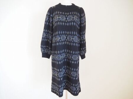 そんなこだわりのある人気ブランドのお洋服はアクイールでも大人気。幅広い世代から支持を得て買取強化中。今回のアイテムは冬らしい雪柄の総柄、黒×青のシックなワンピースです。