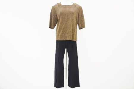ゴールドカラーの半袖ニットに、ブラックのパンツ2点がセットになったスリーピース。
