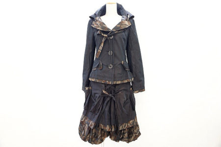 女性らしさを強調する大きめの襟元、リボンのディティール、バルーンシルエット風のスカートなど、フェミニンなデザインを盛り込みつつも、カモフラージュ柄がスパイスとなった甘辛ミックスが楽しめる一着になっております。