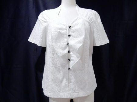 ラインストーンが入ったボタンやフリルのディティールが可愛らしい、ホワイトブラウスを買い取り査定させていただきました。