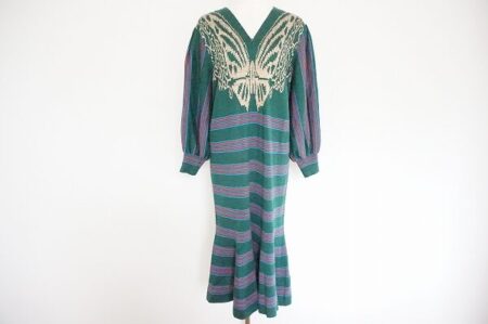 斉藤都世子のモチーフと言えば蝶。今にも羽ばたいていきそうな蝶が素敵な斉藤都世子のワンピースを出張買取ご利用のお客様より買取しました。ボーダーでありながらカジュアルさも少ない上品なワンピースです。シルエットも綺麗に仕上がっているのはさすが斉藤都世子クオリティです。スカート裾もフリルで仕上がりエレガントに着ていただけます。