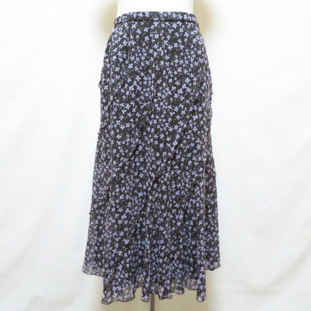 レリアンのスカートを出張買取ご利用のお客様より買取しました。お花をたくさん使っているにも拘らず派手過ぎず決めていただけます。フリルも何気なくて上品。ジャケットからシンプルなシャツなどにも使っていただけるかと思います。グレーと紫という珍しい組み合わせも注目したいポイントですね。