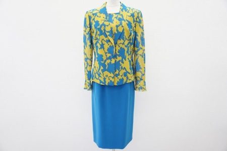 黄色と水色の配色が明るい印象ながらも、斬新で華やかさ満載なセットアップ。