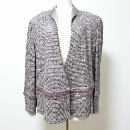 セントジョンのジャケットを出張買取ご利用のお客様より買取しました。サイズは16号です。落ち着いた色使いの中に煌びやかなラメが程よく輝く大人女性らしさが詰まった1枚。レース素材、シャツにも合わせて使っていただけるジャケットです。