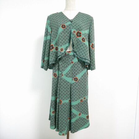 遠くから見ても見入ってしまうような色合いが綺麗なセットアップ。詩仙堂のアイテムを出張買取にて買取しました。和服のような洋服のようなどちらの要素もいい具合に入ったアイテム。花柄もシンプルでポイントとなって素敵です。