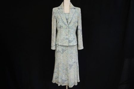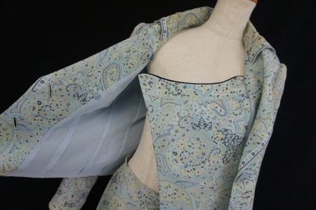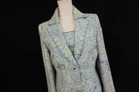 淡い水色を基調にしたペイズリー柄が印象的な、銀座マギーイネスのセットアップスーツを買取させていただきました。