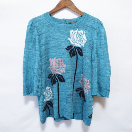 綺麗なブルーに圧倒される斉藤都世子のニット。出張買取ご利用のお客様より買取しました。締まりがありつつも、細身に見えすぎないのがいいですね。薔薇のモチーフも綺麗です。