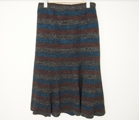 黒ベースにアースカラーのボーダーが大人カジュアルな印象のスカート!裾が程よく広がり足の動きに合わせて揺れるフレアデザインがニットスカート特有の重さを軽減してくれます。ラメがあしらわれているのでボーダーデザインでも上品な印象なるのが嬉しいですね。斉藤都世子のニットは愛用者も多く着心地と軽さ暖かさには定評がありますのでデイリー使いとして長く愛用頂けるのでオススメです。