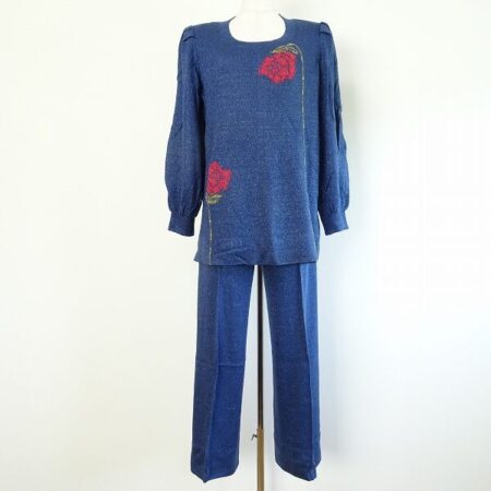 斉藤都世子のセットアップを買取しました。出張買取です。濃いめの紺に華やかなバラが美しく咲く1点。ラフな印象を与えつつもセンタープレスを応用するなど程よく締まったのもいいですね。