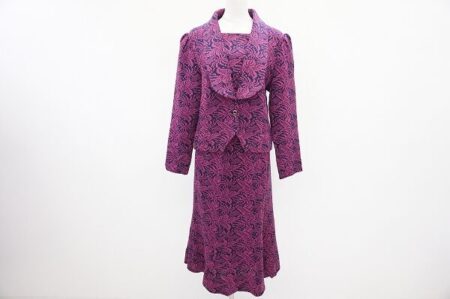 今回サイトウトヨコ斉藤都世子の大人なセットアップを買取させて頂きました。大人ならではのピンクみがかった紫の総柄でエレガントなジャケットのセットアップ。スカートはセミフレアでロング丈。ジャケットはビックカラーで小顔効果があります。パンツと合わせてカジュアルダウンさせてもお洒落ですね。お手持ちの洋服とくみあわせてみたくなりませんか?