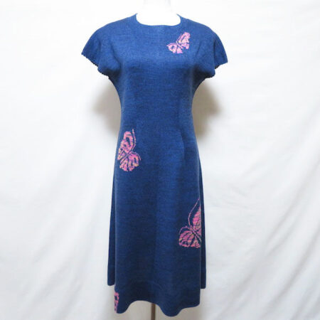 出張買取で斉藤都世子のワンピースを買取しました。濃い青と羽ばたく蝶が調和していてうっとりしてしまいます。体を優しく包み込むかのうようなこだわりが詰まったシルエットもポイントです。