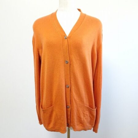 ポップ過ぎない上品なオレンジが上質ブランドのフェラガモらしいカーディガンを買取しました。買取方法は出張買取です。シアー素材のトップス、タートルネックセーターなどの上から着ていただいても上品になります。適度に開いたVネックがエレガント。ちょっとした寒さをしのぐのにもばっちりです。
