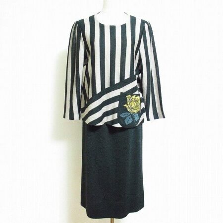 斉藤都世子のセットアップを買取しました。緑×ベージュの珍しい組み合わせが特徴の1点。バラのモチーフもさりげなくポイントになっており、程よい綺麗さも際立ててくれます。
