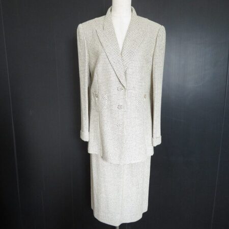 シルクならではの品の良さを感じるジュンアシダのスカートスーツ。宅配買取ご利用のお客様より買取しました。ツイードとのバランスも最強で品のいいスタイルを極めたい方にぴったりです。白っぽいのでさわやか、そして清潔感も出していただけるのがありがたいアイテムかと思います。