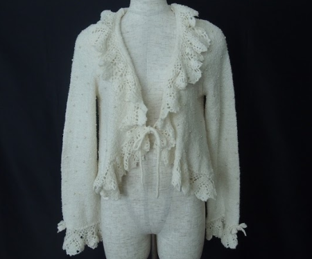 今回、お客様より買取査定させていただいたカーディガンもホワイト地にパールの華やかさ、リボンの可愛さ、レース編みの繊細さをバランス良く併せ持ちとても可愛らしい雰囲気に1枚です。ホワイトをトップスに持ってくると顔周りを明るくしてくれボトムスやインナーの色味や柄を問わずに着れる万能なライトアウター。今買って冬はコートの下に可愛さを隠し持ち、寒さの残る春先は思う存分着まわせる!スリーシーズン使えるのも魅力です。