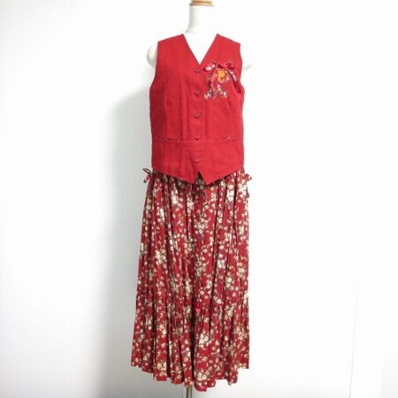 出張買取におきましてピンクハウスのセットアップを買取しました。鮮やかな赤と小柄花の相性が素敵なセットアップです。ノースリーブなので個性も強すぎず綺麗さを程よく出していただけるかと思います。