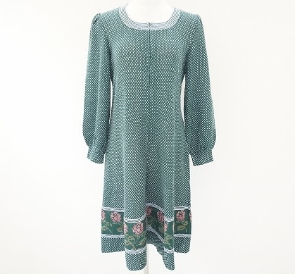 大人の女性でも着やすく今シーズン人気のグリーンベースのフェミニンなワンピース。優しい色使いとピンドット柄が幼くなる事無く大人女性が上品に着こなせるようになっています。裾にのみバラの模様があしらわれているのとフレアデザインのシルエットが相性抜群で軽やかに着れるのも長く愛用出来るポイントです!首周りはスクエアネックデザインでデコルテラインを見せる事で顔周りをスッキリ首が長く演出してくれます。