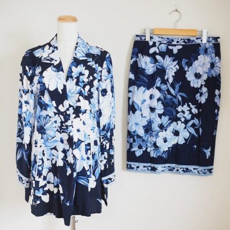 レオナールのセットアップを買取しました。出張買取です。シルクの豪華さもじわじわ感じられる1点。落ち着いた紺、青、白のバランスも最高で大人の優雅さを出していただけます。