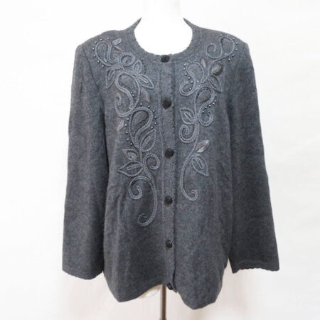 シルク素材のカーディガンを出張買取ご利用のお客様より買取しました。暗すぎず明るすぎないグレーが素敵な1枚。模様も大きいですが、控えめでもあるため中に色々なお洋服を着て楽しんでいただけるかと思います。