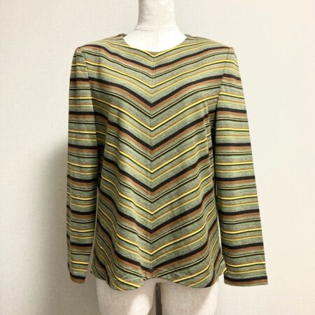 出張買取でレリアンのカットソーを買取しました。緑×茶×黄の鮮やかで一風変わったボーダーに見とれます。しっかりおしゃれでもあり、ボトムスの幅も広がりそうな1着です。