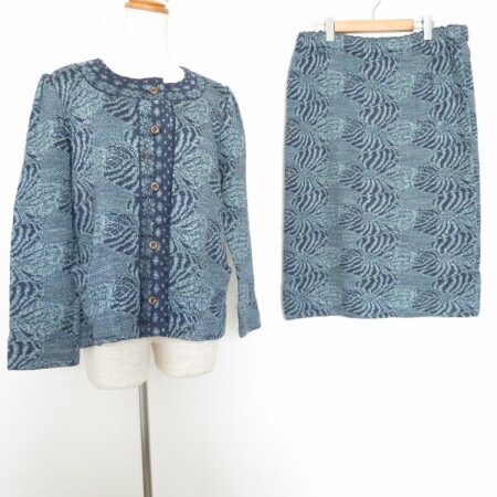 斉藤都世子のセットアップを出張買取ご利用のお客様より買取しました。流れるような綺麗な絵柄が珍しいセットアップです。冷静さを出せる色合いにも注目。華やか過ぎず清潔感を出していただけるかと思います。