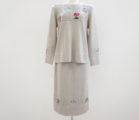 エレガンス×繊細な雰囲気を感じる刺繡やレース、それらを引き立てるグレージュのワントーン。シンプルなタイトスカートとラウンドネックカットソーのセットアップの至る所に女性デザイナー・サイトウトヨコらしさを感じさせられます。首回や袖にあしらわれた刺繡が小ぶりながらも上品でネックレス等のアクセサリーがなくとも素敵な装いにしてくれそう!