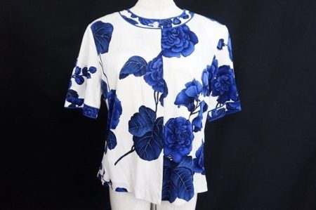 白に美しい青の薔薇プリントがエレガントで爽やかな印象を与えます。
