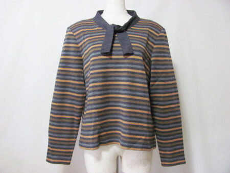 Leilianレリアンの長袖アイテムを買取しました。グレー×黄×水色のボーダーがカジュアルな長袖ニットです。リボンタイがキレイ目、きちんと感を出しつつも、ボーダーのカジュアルな良さも与えてくれる1枚。お家で楽しんでいただくのはもちろん、お出かけ着としても!最近はリモートワークもありますので重宝するアイテムでしょうか。