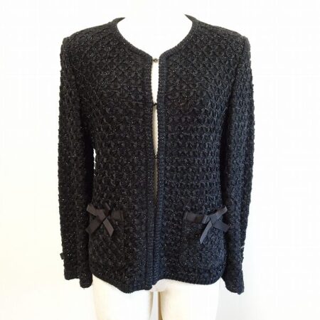 マダムジョコンダのジャケットを買取しました。サイズは38です。黒でシンプルながらもラメやリボンで可愛らしさを加えてくれるのがありがたい1点。上品女性になりたい方も気軽に試せるアイテムです。