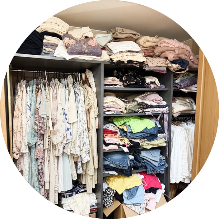 長年溜め込んだ衣類がクローゼットに山積みで、自分では手がつけられないとご相談をいただきました。 仕分け一部査定〜買取〜お引き取り対応まで一括で行い、スッキリ片付きました。