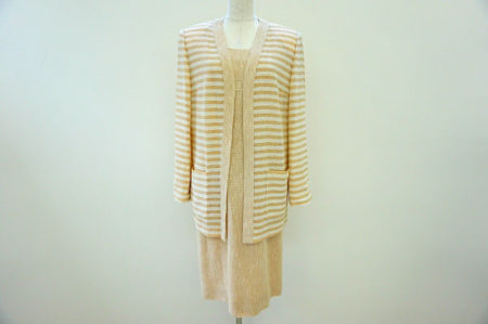 ジュンアシダのワンピーススーツを出張買取にて買取しました。主張が少なく、柔らかい印象を連れて着てくれるベージュカラーのスーツワンピース。1セットあるといざという時に使えます。お出かけからビジネスライクなシーンにも活用できて便利です!