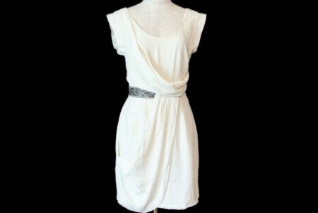 ウエストマークのディテールをポイントに、布が流れるような独特なデザインが印象的。