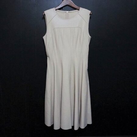 フォクシーニューヨークのワンピースを出張買取ご利用のお客様より買取しました。肌なじみのいいベージュが綺麗です。プリーツもしなやかで着る度に揺れる感じが素敵。フェイクレザーならではの程よいカッコよさにも注目。