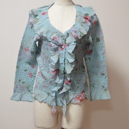 ユキトリイのブラウス 40サイズを出張買取ご利用のお客様より買取しました。目に余るような大胆なフリル。水色ベースで爽やかさも程よく出していただけます。シワ加工でちょっとカジュアルに決まるのもいいですね。