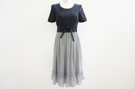 日々のあらゆるシーンを考え、スウィートとエレガンスをミックスしたアイテムが豊富なトゥービーシック。シンプルなブランドラインをベースにちょっとした甘いディテールを加えることで、いくつになっても女性らしい可愛い部分を演出してくれるブランドです。そのトゥービーシックのエッセンスを含んだワンピースをお売り頂きました。モノトーンベースで落ち着いた印象の中にリボンと控えめなフリルを施したことで、キュートさを演出したワンピースです。トップスをタイトにすることでカジュアル過ぎないシルエットになっています。
