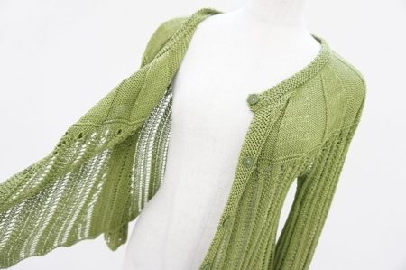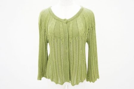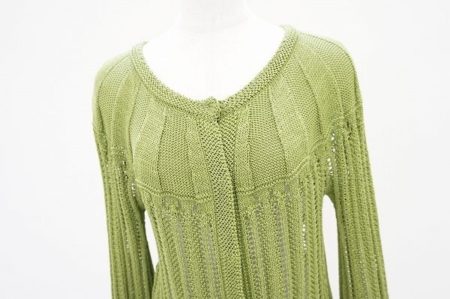 今回は、シンプルなシルエットに編み方の違いによるニュアンスがプラスされた、草色のカーディガンを買い取りさせていただきました。