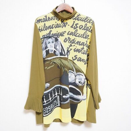 出張買取にてトクコのチュニックを買取しました。サイズは9号です。カーキの渋さを表現しつつ、ポップな絵柄でおしゃれ度を上げてくれます。裾のフリルもしっかりあって細かい部分までこだわり満点です。