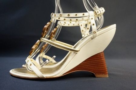 ウッドヒールでナチュラルな雰囲気とホワイトレザーとゴールドのアクセントでエレガントで華やかな雰囲気を併せ持ったデザインです。