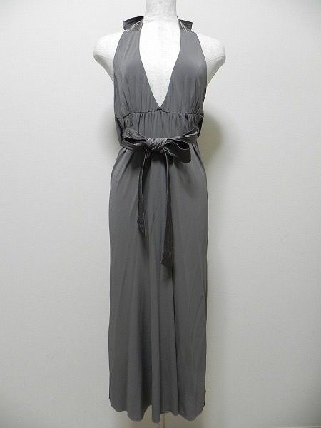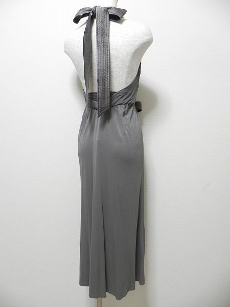 首の後ろでリボンを結ぶホルターネックデザインで、背中は大きく開き胸元が強調された大胆なロングドレスになります。
