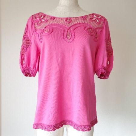 伊太利屋のカットソーを出張買取ご利用のお客様より買取しました。元気なピンク色ですが、ビジューやかぎ編みとのバランスで程よい綺麗さをプラスで着ます。袖の膨らみも可愛いですね。シンプルなジーンズと合わせても素敵かと思います。