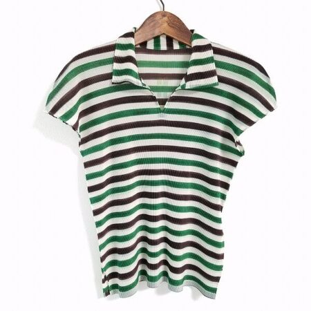 出張買取にてプリーツプリーズのカットソーを買取しました。サイズは3です。緑と茶色のボーダーがシックで可愛くもあります。ボーダーながらも爽やかさがあり、二の腕もスッキリ出せるのがいいですね。